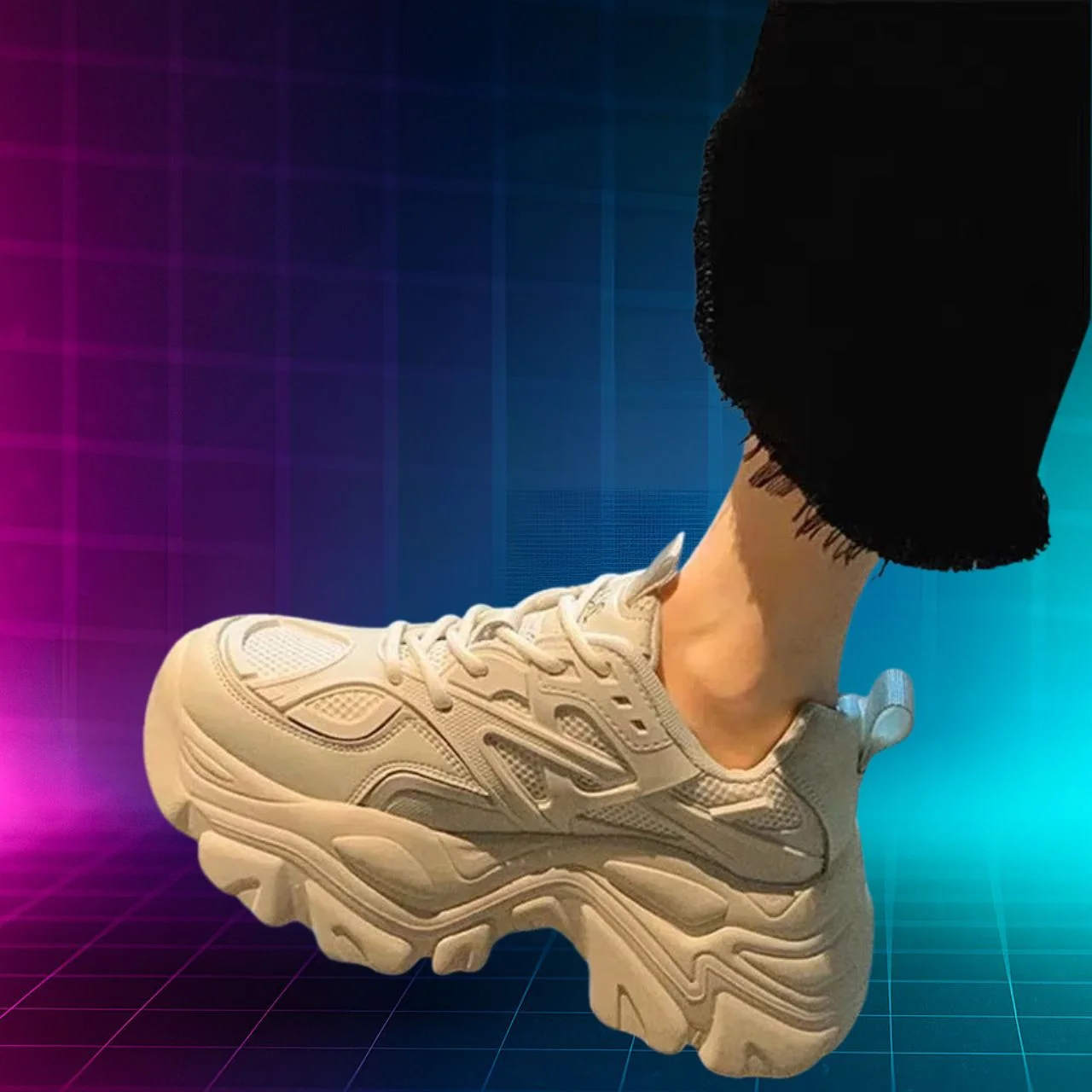 The Dad White Sneakers – SOLARIS F1 from the AURORA collection fuse nostalgic ’90s style with up-to-date comfort. The chunky sole adds height and presence, while breathable materials keep your feet cool. These sneakers are designed for everyday wear, giving you both standout style and effortless versatility for your wardrobe.